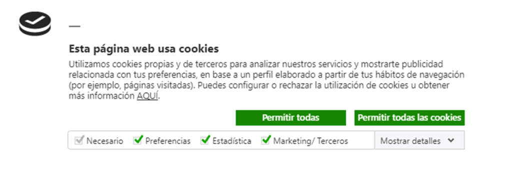 Ha de ser una ventana emergente inferior o superior, con una duración mínima de visión por parte del usuario del al menos 60 segundos, vinculando la información de la pestaña de política de cookies.